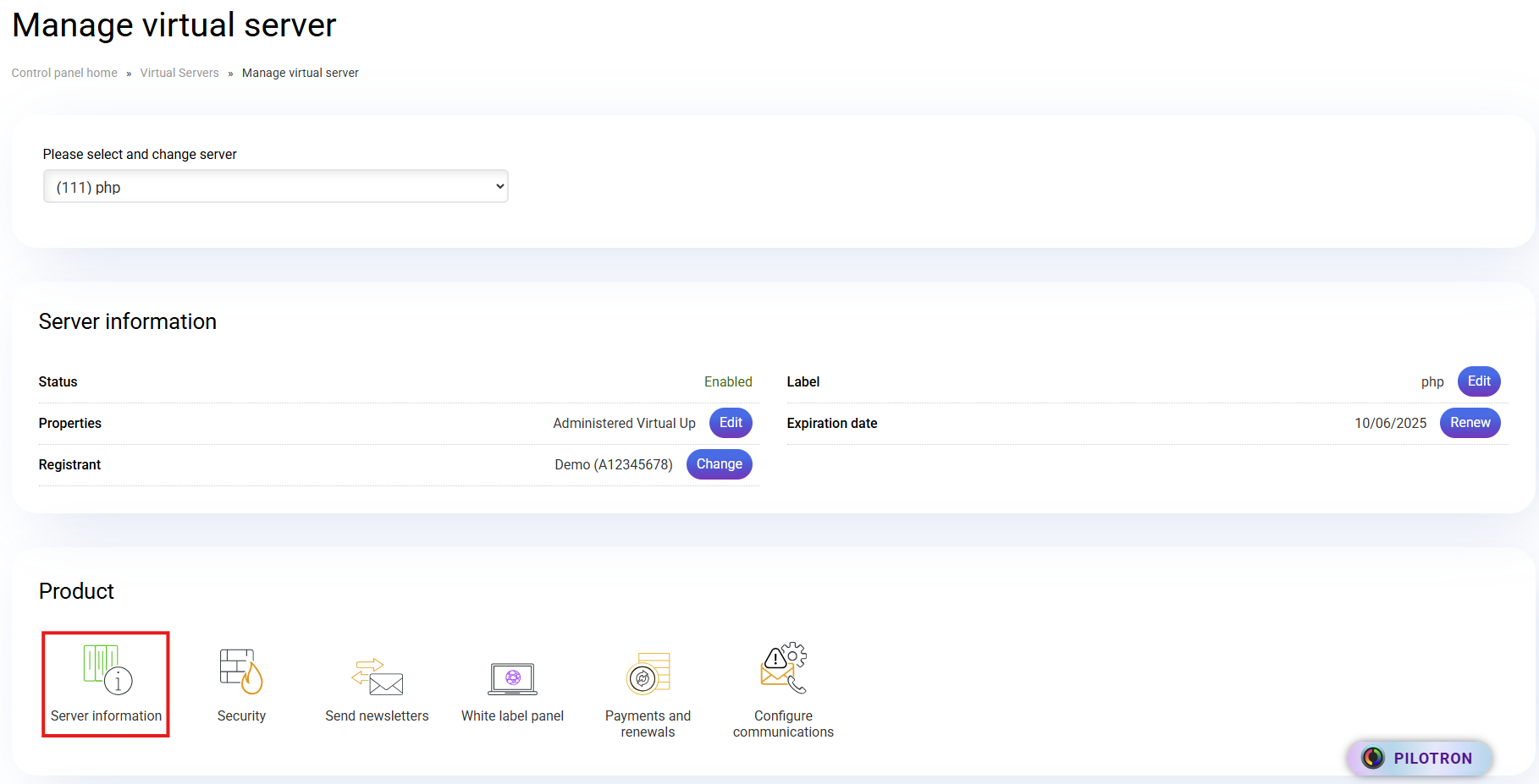 From the Virtual Up server control panel, you can conveniently manage your server. The panel is composed of an administrative section, a server control and management section, and a hosting management section. Administrative management From the ...