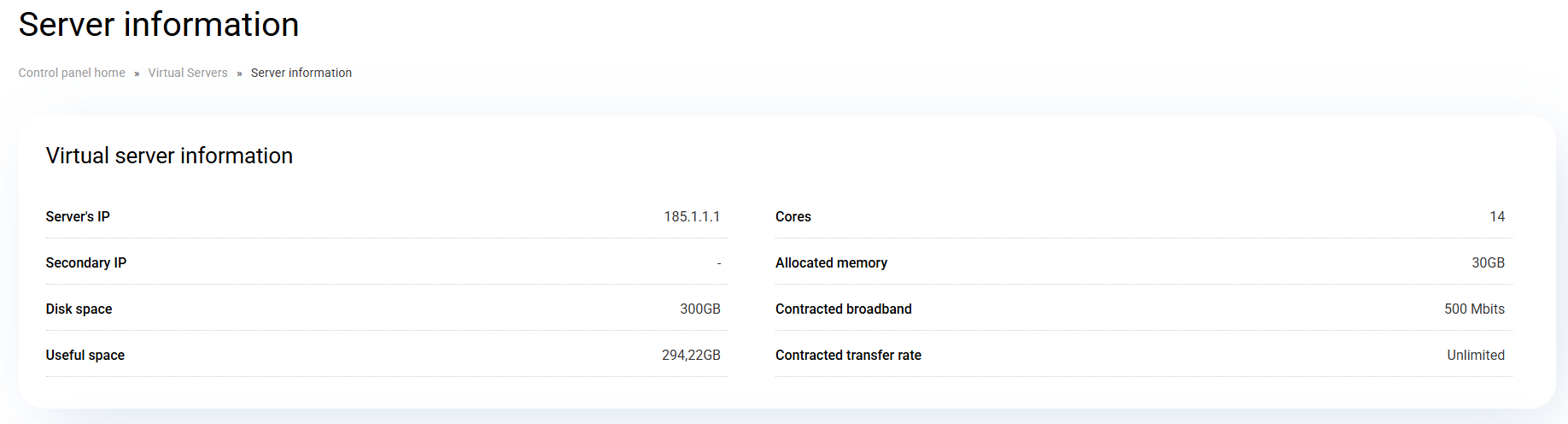 If you need to check the characteristics or status of your Virtual server service, you must access the Virtual management from your cdmon control panel and click on the Server Information option. On the following screen you will see three main ...