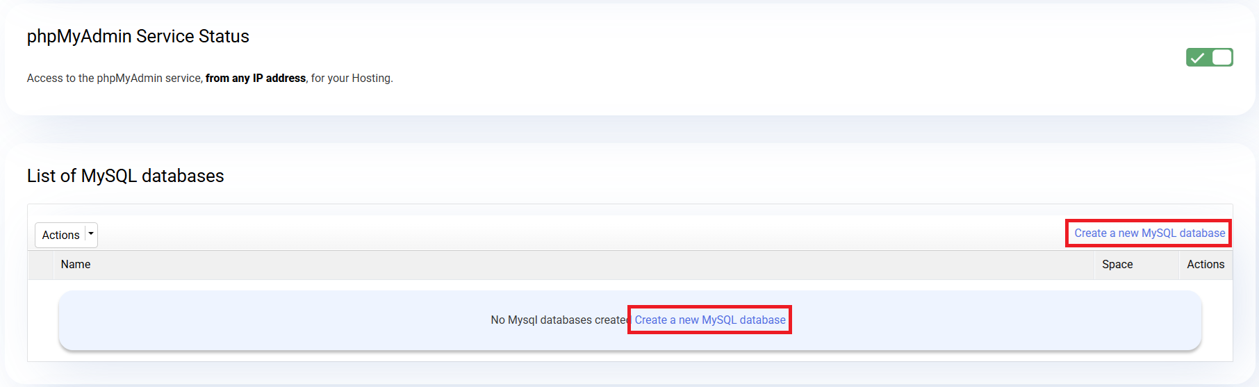 Just below the connection details, find the section "Create a new MySQL database". Enter the name you want to assign to the database and click the Create DB button.