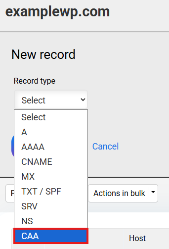 In the "Record type" dropdown menu, select CAA.