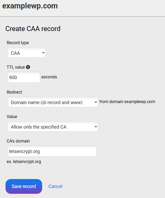 Once inside the CAA record configuration panel, you can configure the following parameters: