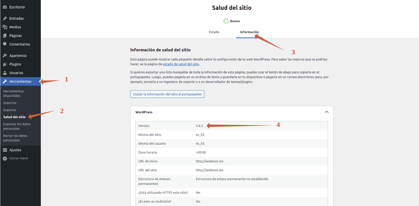 Podemos comprobar la versión en la sección Herramientas / Salud del sitio / Información.