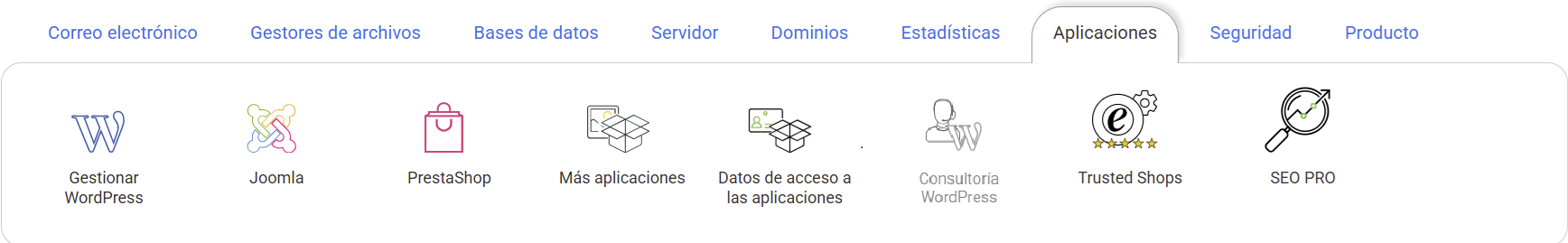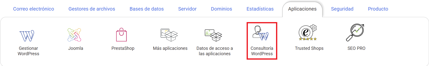 Puede contratar el servicio desde la gestión del hosting que quiera que actualicemos. En este caso, deberá acceder hasta la sección de Aplicaciones y clicar sobre Consultoría Wordpress: