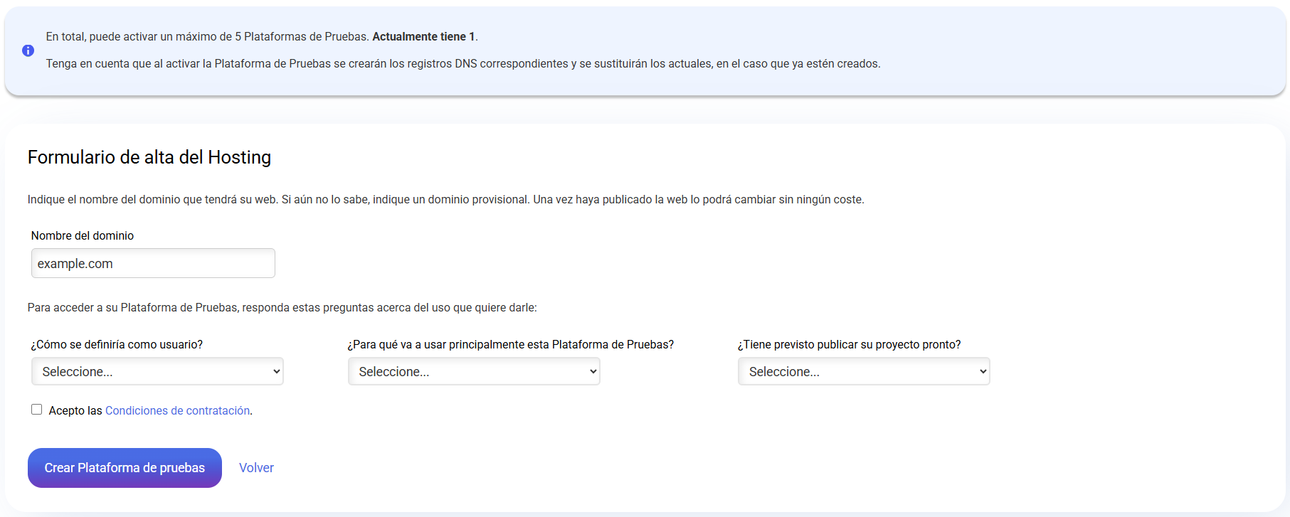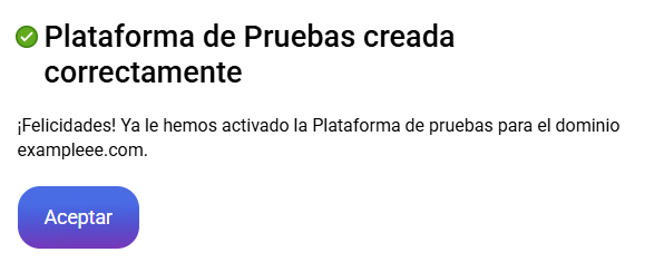 Una vez indicado el dominio, si aceptas las condiciones y seleccionas la opción de "Crear plataforma de pruebas", comenzará el proceso de creación. Al finalizar saldrá un mensaje indicando que se ha realizado con éxito.