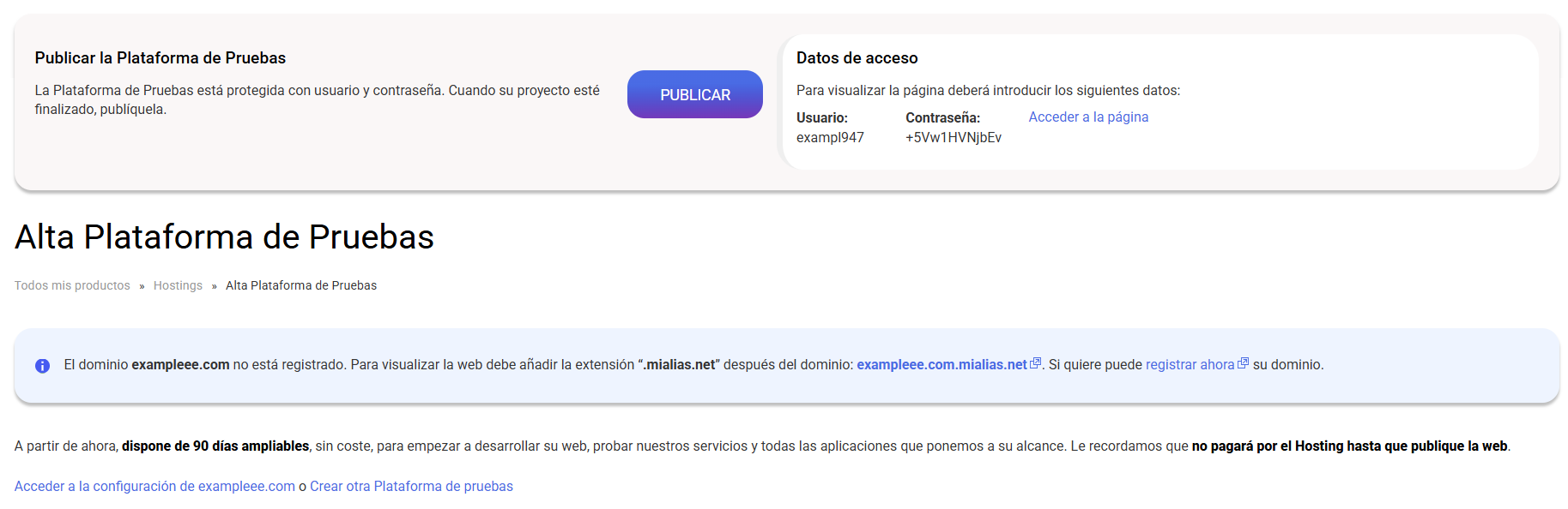 Al finalizar la creación aparecerá una pantalla con información que has de tener en cuenta. Como, datos de acceso, días disponibles o si necesitas usar la extensión ".mialias.net".
