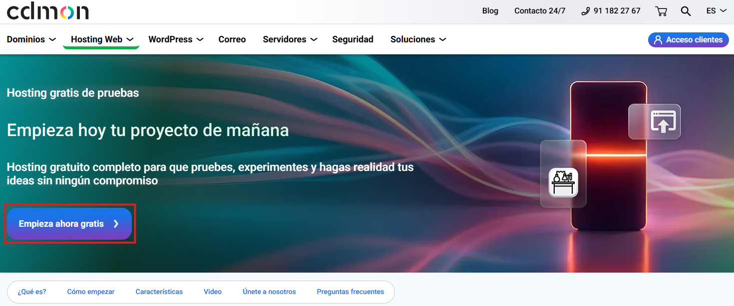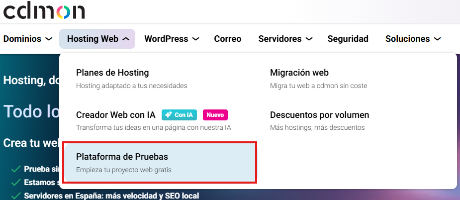 cdmon.com y acceder al apartado Hosting donde encontrarás la opción; Plataforma de pruebas.