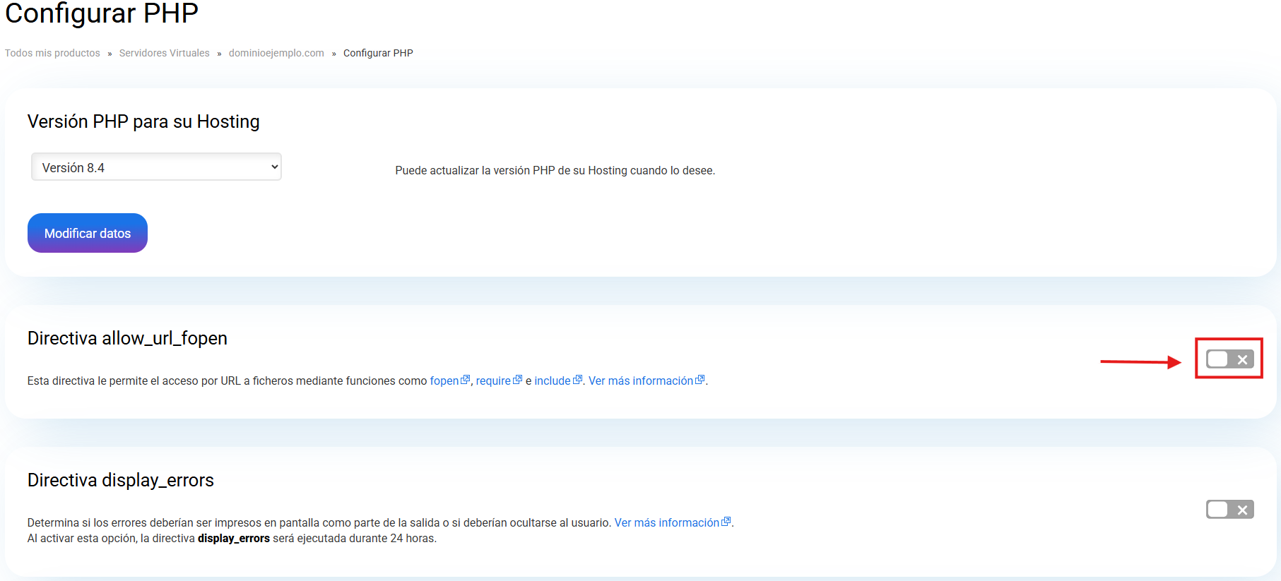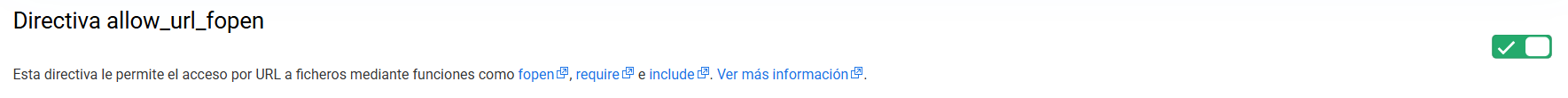 Una vez ahí, ha de ir hasta la "Directiva allow_url_fopen" i verificar que el botón de esta columna esté activo. En caso de que aparezca como Desactivado ha de clicar sobre este para activar-lo: