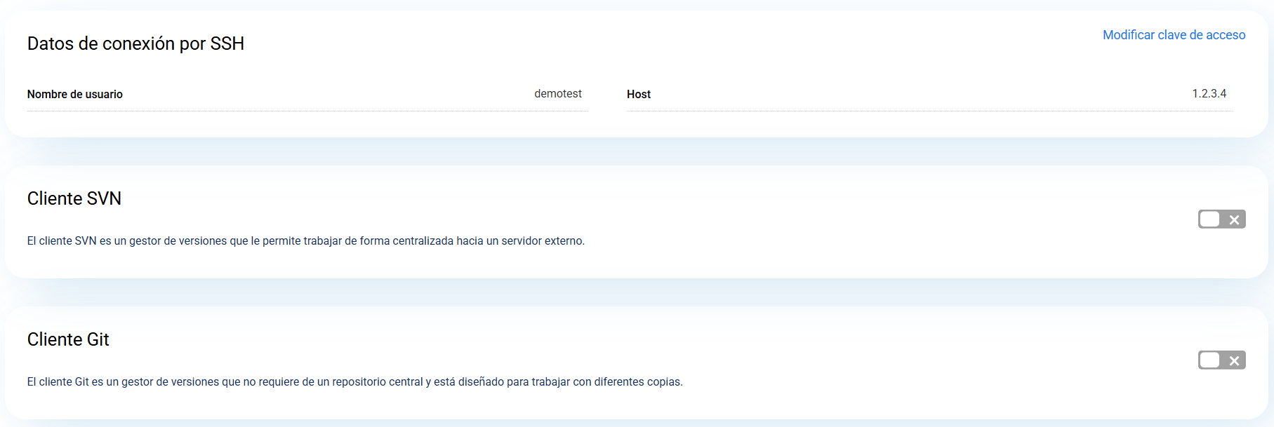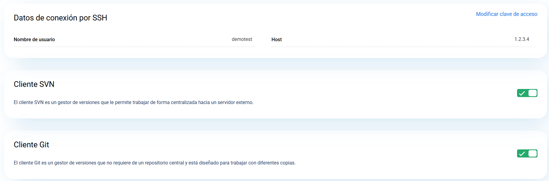 Para poder activar estos servicios debes tener activado el acceso por SSH. Una vez dentro de este apartado, tienes la opción de activar uno o ambos gestores de versiones. Sólo tienes que pulsar en el botón de Desactivado para activar el servicio.