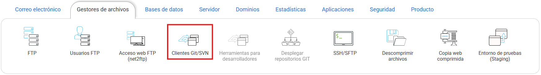 En el caso de las versiones 7.3 de inferiores de PHP, puedes activar estos gestores de versiones en el Panel de control del alojamiento, pulsando en el icono de Clientes SVN/Git, en el apartado de "Gestores de archivos".