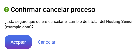 En el caso de que decidas interrumpir la gestión por cualquier motivo, podrás cancelarla pulsando, en el apartado "Cancelar cambio de titular", el botón Cancelar, que mostrará un panel de confirmación para aceptar la cancelación del proceso.