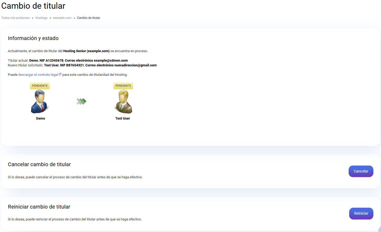 El titular actual se muestra a la izquierda y aparecerá "Pendiente" hasta que acepte el cambio desde el mensaje que recibirá en la cuenta de correo asociada a su contacto de facturación. El icono de la derecha corresponde al nuevo titular, y también se visualiza como "Pendiente" hasta que acepte su propio mensaje que recibirá a la cuenta de correo que figura en su contacto de facturación.