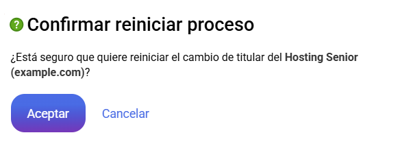 Si por cualquier motivo decides reiniciar el proceso, podrás reiniciar pulsando en la opción Reiniciar en el apartado "Reiniciar cambio de titular". Se mostrará un panel de confirmación para aceptar la cancelación del proceso.