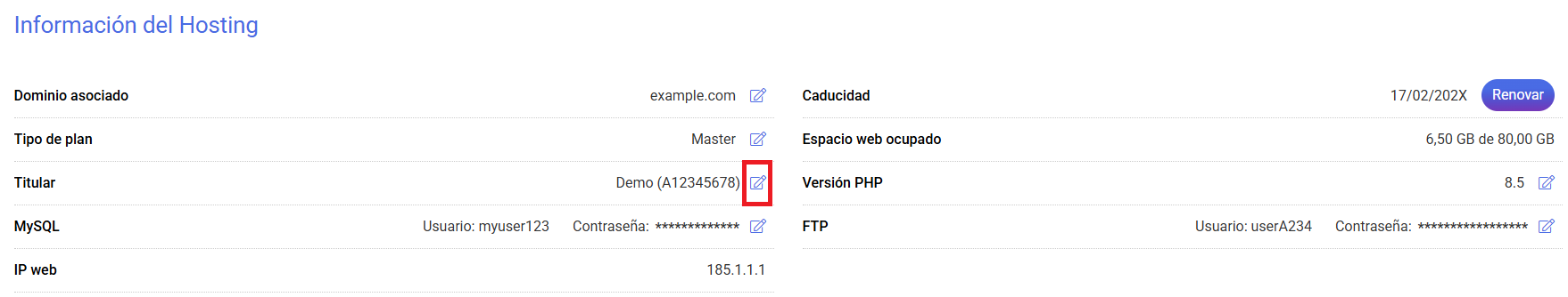 Accede a la pantalla de gestión del hosting, Virtual Up, servidor dedicado o Multihost que deseas modificar y en la sección 'Información del alojamiento' pulsa en el apartado 'Titular' la opción Cambiar.