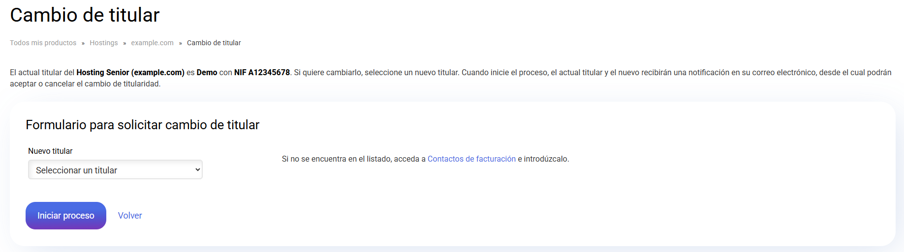 Cuando tengamos seleccionado el nuevo titular, pulsamos sobre la opción Iniciar proceso.