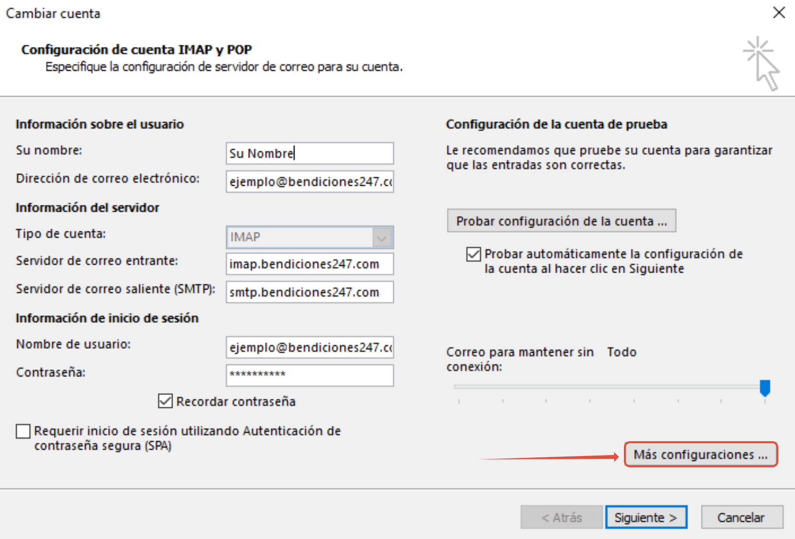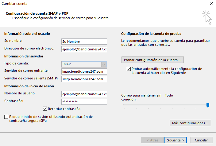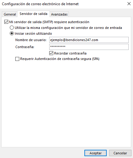 En este caso, utilizamos como ejemplo la cuenta “ejemplo@bendiciones247.com”, esta dirección se debe modificar por el nombre de la cuenta de correo a configurar.