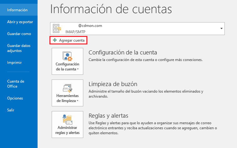 Inicia Outlook y accede al apartado Herramientas y Cuentas. Selecciona la opción Agregar Cuenta y se inicia el proceso de configuración.