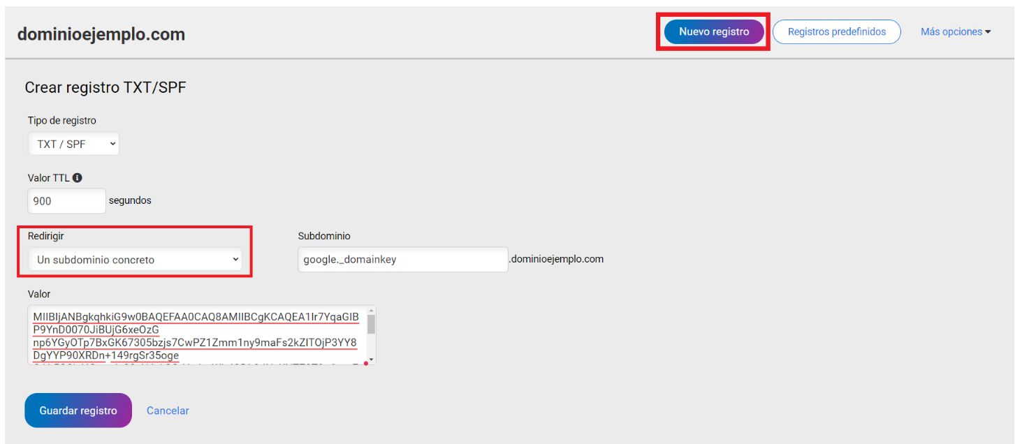 Redirigir: Ingresa con la opción de “Un subdominio concreto”, en nuestro caso quedará como google._domainkey.dominioejemplo.com.