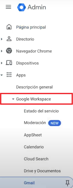 Para empezar el proceso, debe iniciar sesión en tu cuenta de Administrador de Google. Una vez ya esté dentro, debe ir al menú lateral, en Apps, y ahí seleccionar Google Workspace y “Gmail”: