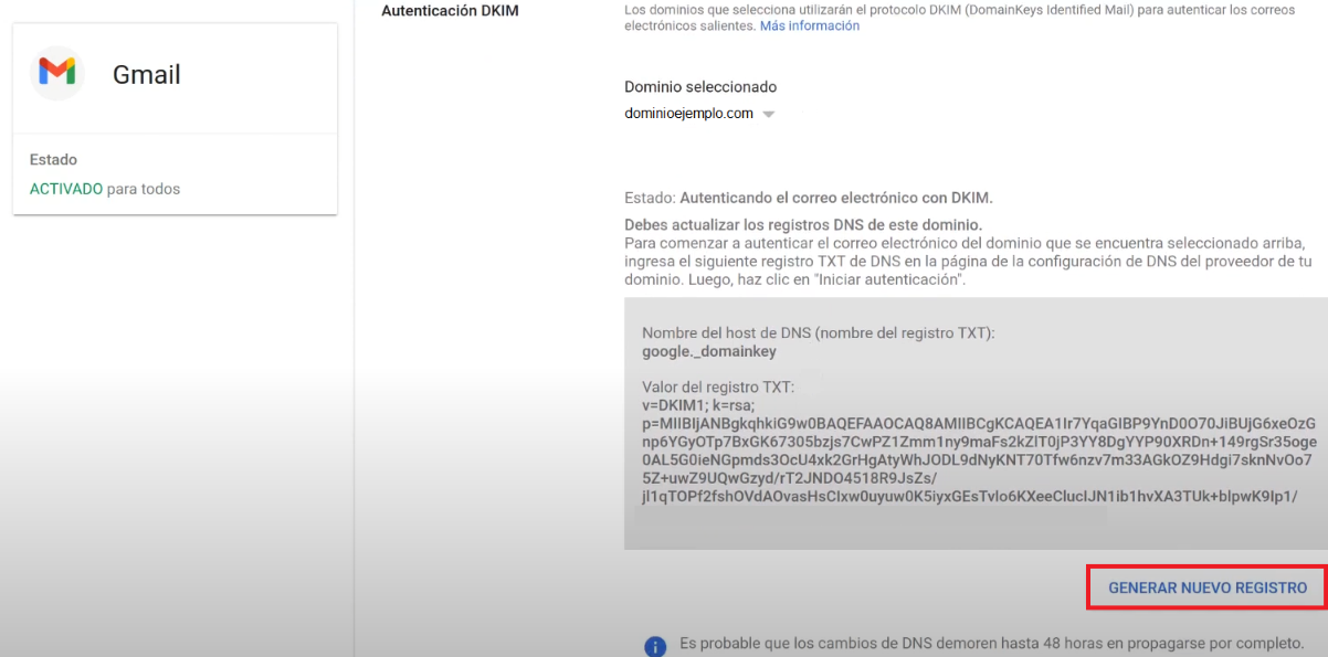 En acceder aquí, se mostrará un registro DKIM creado por defecto. Seleccione “Generar nuevo registro”. Mostramos una captura de ejemplo de cómo se genera el registro: