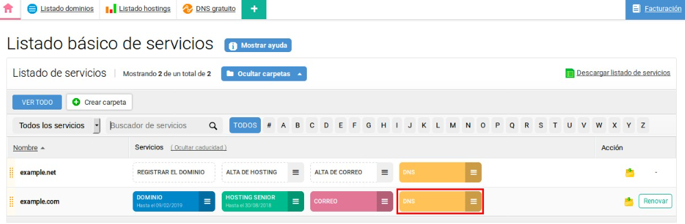 Para configurar un registro SPF, accede directamente a Gestionar DNS desde el "Listado básico de servicios" de tu panel de control y sigue los siguientes pasos.