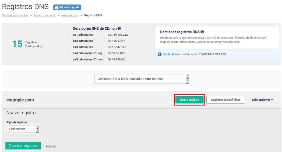 En el listado de "Registros DNS" pulsa en Nuevo registro y en"Tipo de registro" escoge la opción TXT/SPF.