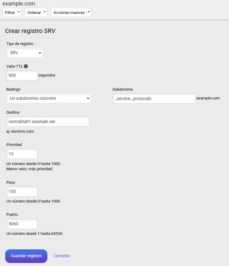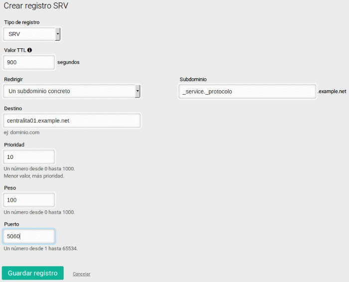 Por ejemplo: cuando configuras un registro SRV para el host _sip._tcp.example.net rellenas los campos siguientes: