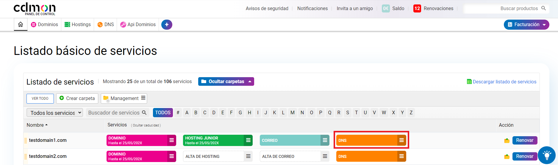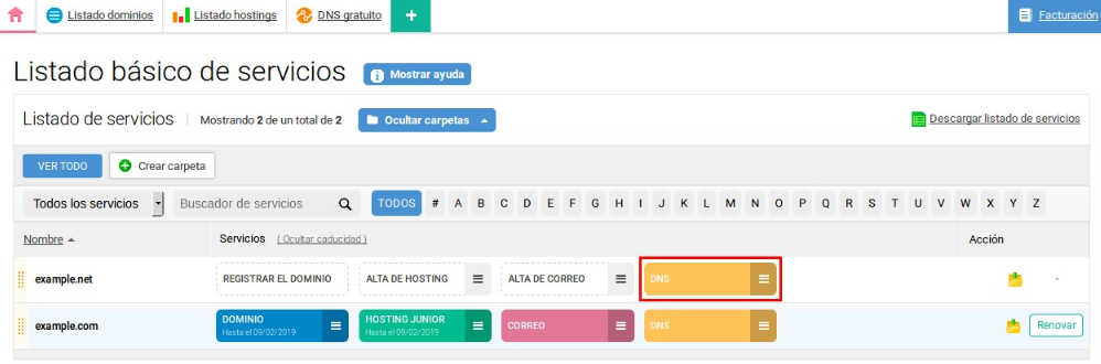 Para configurar el registro SRV de tu dominio, accede directamente a "Gestionar DNS" desde el "Listado básico de servicios" del panel de control y sigue los siguientes pasos.