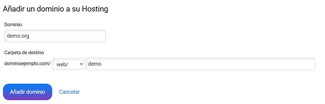 Indica el dominio que quieres alojar y el directorio dentro del alojamiento que contendrá la página web. En caso de no existir la carpeta se creará automáticamente.