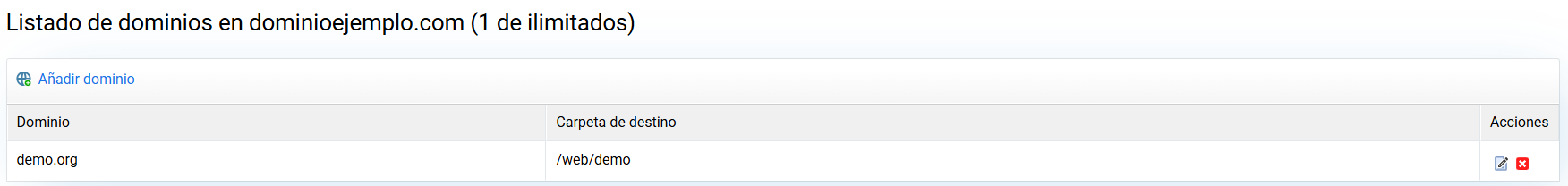 Los dominios creados aparecen en el listado, desde donde los puedes editar o borrar: