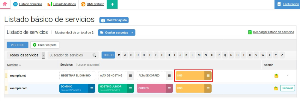 Para configurar un registro NS en un subdominio, accede directamente a gestionar DNS desde el "Listado básico de servicios" del panel de control y sigue los siguientes pasos.