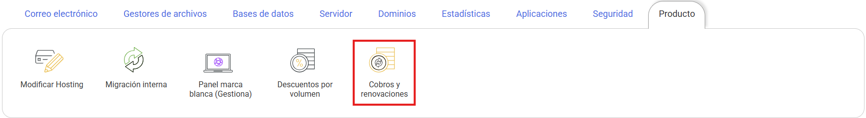 En la pantalla de "Gestión del alojamiento" tienes que desplazarte hasta la sección 'Producto' y pulsar en la opción Cobros y renovaciones.