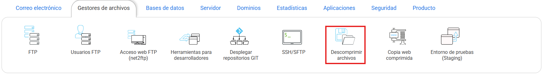 Cuando tienes que subir muchos ficheros a tu alojamiento, una buena opción es hacerlo mediante un fichero comprimido. Una vez subido, para descomprimir el fichero, puedes utilizar la herramienta que disponemos en el Panel de control del alojamiento, en el apartado "Gestores de archivos", accediendo en el icono de Descomprimir archivos.