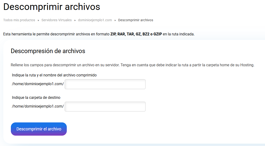 Para utilizar esta herramienta, tienes que subir por FTP el fichero que quieres descomprimir. Luego, dentro de la herramienta, tienes que especificar la ruta donde se encuentra el fichero y la ruta donde quieres descomprimirlo. Una vez especificados los datos, pulsa en "Descomprimir el archivo" para iniciar el proceso. Los formatos de compresión son ZIP, RAR, GZIP y TGZ. Una vez finalizado el proceso, recibirás un correo confirmando la finalización de la descompresión.