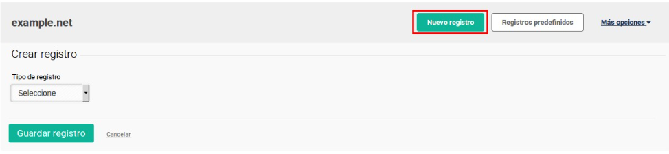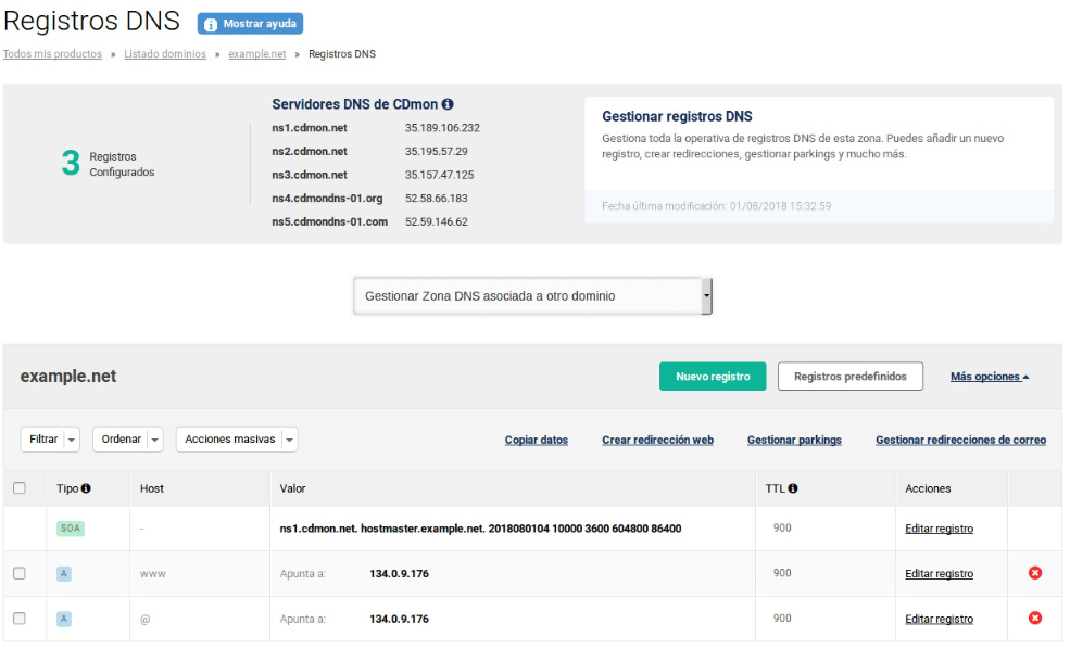 El panel de control de los registros DNS del dominio consta de las siguientes partes:
