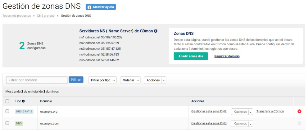 Servidor DNS de cdmon: nombres de los servidores DNS disponibles. Para utilizar el Gestor DNS de cdmon, los dominios deben utilizar los servidores DNS especificados en este recuadro.