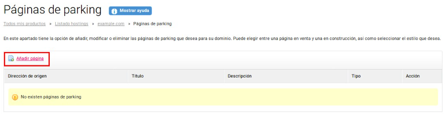 Páginas de parking: tienes la opción de añadir, modificar o eliminar las páginas de parking que desees para nuestro dominio. Puedes elegir entre una página en venta y una en construcción, así como seleccionar el estilo que quieras.