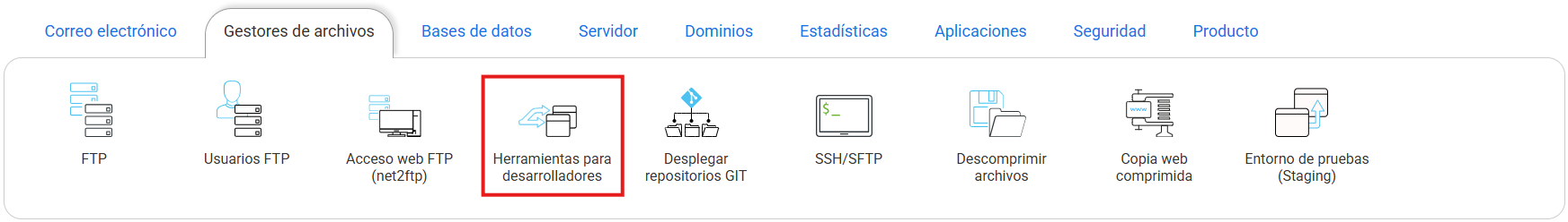 - Desde la gestión del hosting busca la sección "Gestores de archivos" y selecciona la opción "Hosting para desarrolladores".