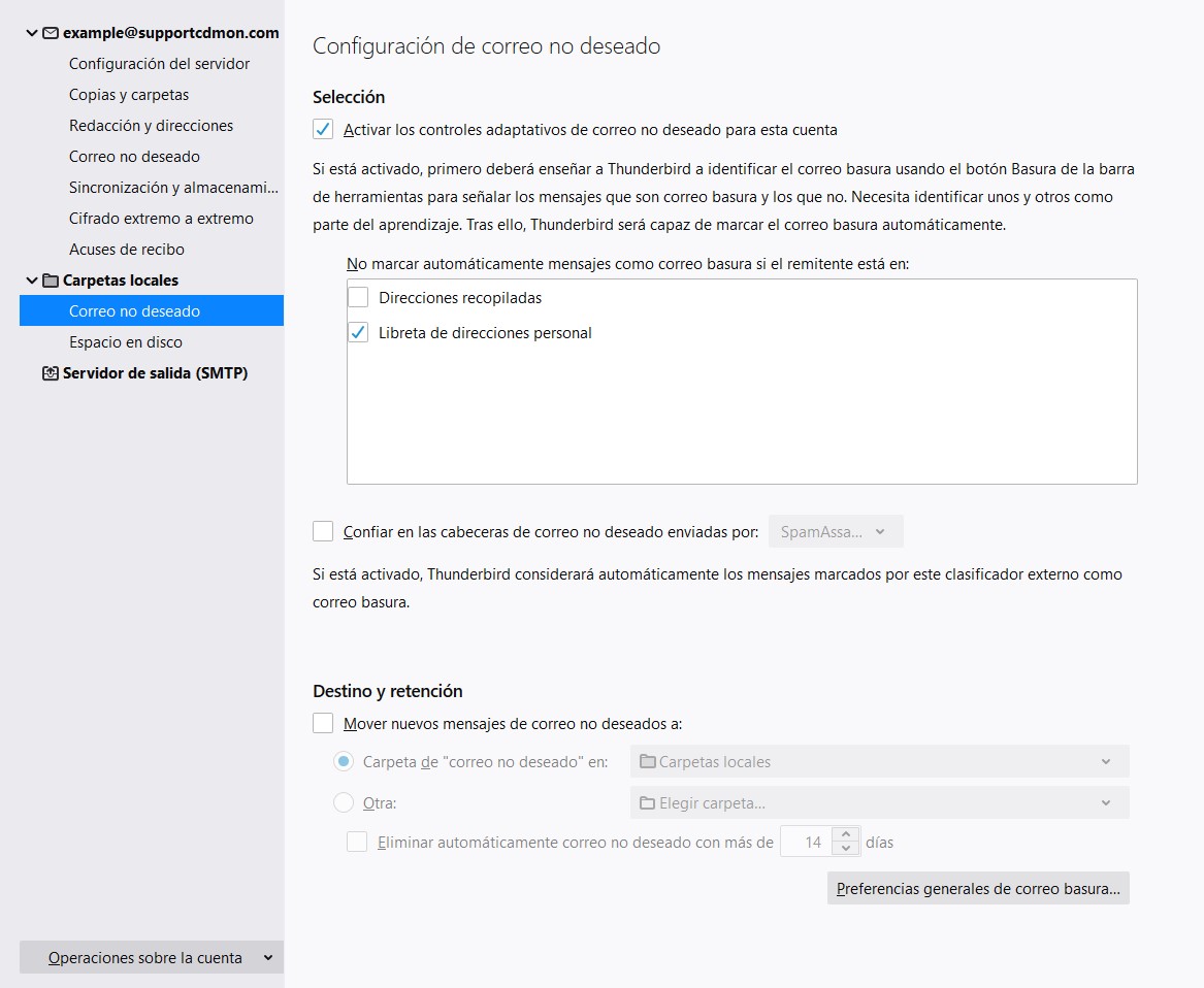 En la opción "Correo no deseado", puedes configurar diversas opciones que te permiten establecer los parámetros necesarios para la gestión del correo basura.
