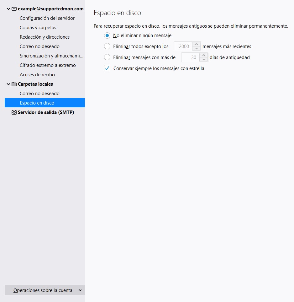 La siguiente imagen muestra las opciones de configuración referentes al apartado "Sincronización y almacenamiento", en las cuales puedes establecer los parámetros referentes a la sincronización de mensajes, espacio en disco y recuperación de espacio en disco.