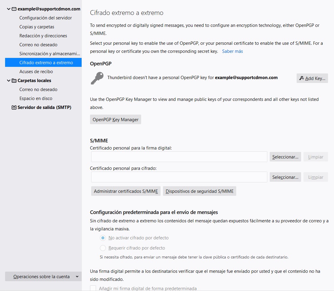 En el apartado "Cifrado extremo a extremo" puedes seleccionar los certificados para firmar los correos enviados, los que usas para cifrar/descifrar mensajes y los dispositivos de seguridad.