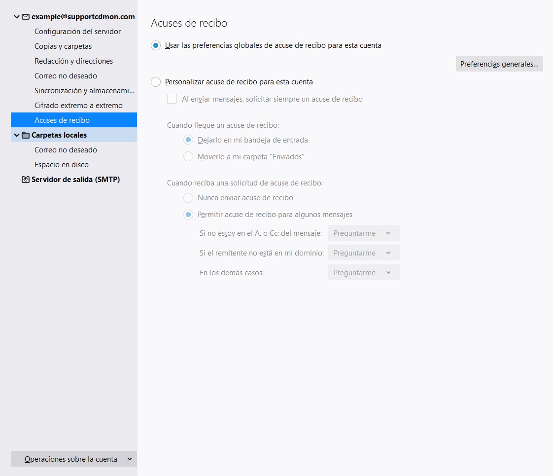 Si seleccionas la opción de "Acuses de recibo" puedes configurar las preferencias globales de acuse de recibo y personalizar el acuse de recibo para la cuenta de correo que estás configurando.