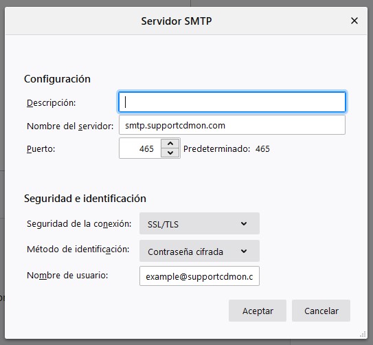 En este caso, utilizamos como ejemplo la cuenta “example@supportcdmon.com”, esta dirección se debe modificar por el nombre de la cuenta de correo a configurar.