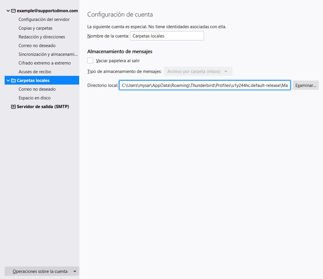 Si accedes al apartado "Carpetas locales", es posible cambiar el nombre de la cuenta, activar la opción de vaciado de la papelera al salir del gestor de correo e indicar el directorio local donde se guardarán los datos.