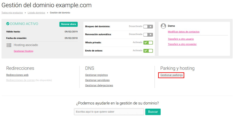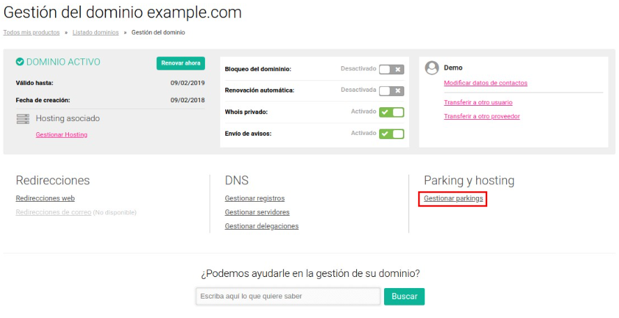 Acto seguido accederás a la gestión del dominio, donde tienes que pulsar en la opción Gestionar parking que encontrarás en el apartado "Parking y hosting".