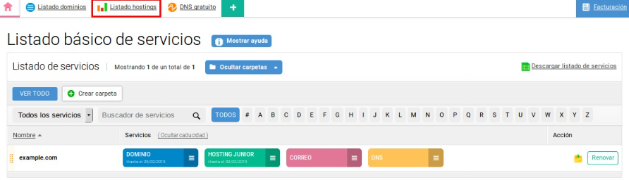 Para acceder desde el listado de hosting debes pulsar en la opción Listado hostings del menú superior en el listado básico de servicios.