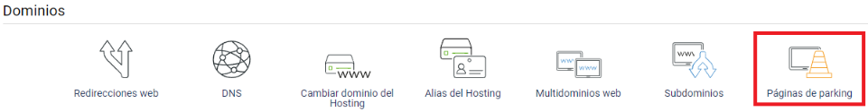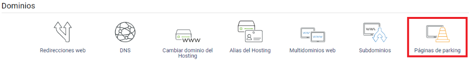 En la gestión del alojamiento, en el apartado "Dominios" encontrarás la opción Páginas de parking, donde tienes que pulsar para configurar la página de parking.