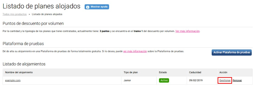 Una vez en la pantalla de "Listado de planes alojados", verás un listado con los alojamientos que tienes en cdmon. Debes pulsar en la opción Gestionar del alojamiento que quieres configurar la página de parking.