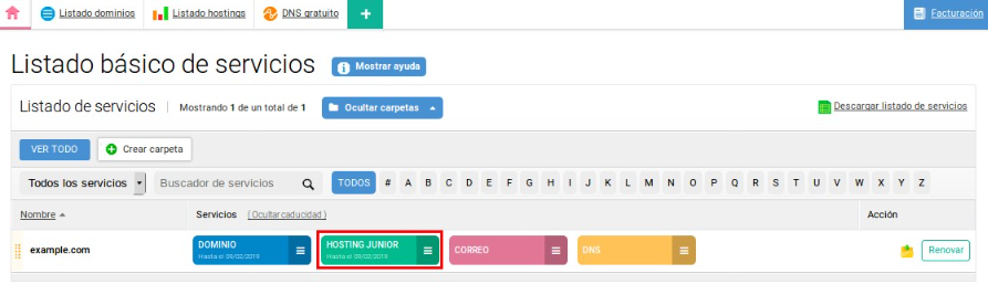 Para acceder desde el listado básico de servicios tienes que pulsar en la opción HOSTING + TIPO DE PLAN (en el ejemplo es Hosting Junior) del alojamiento que quieres gestionar.