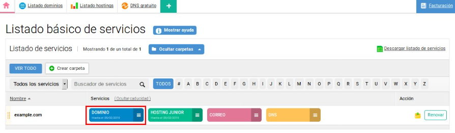 Para acceder desde el listado básico de servicios tenemos que pulsar en la opción DOMINIO del dominio que queramos gestionar.