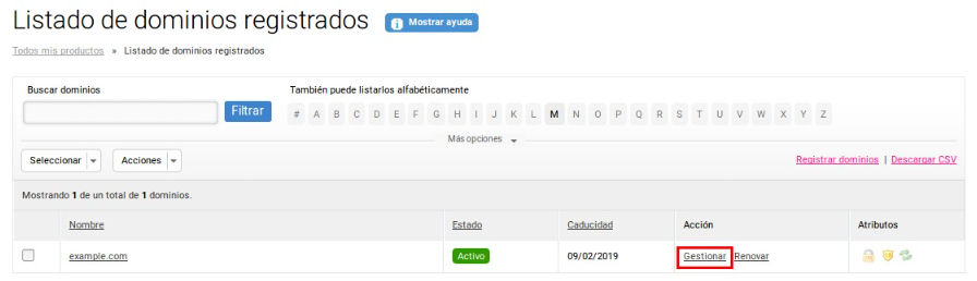 Una vez en la pantalla de "Listado de dominios registrados", veremos un listado con los dominios que tenemos registrados en cdmon. Debemos pulsar en la opción Gestionar del dominio que queremos configurar la página de parking.